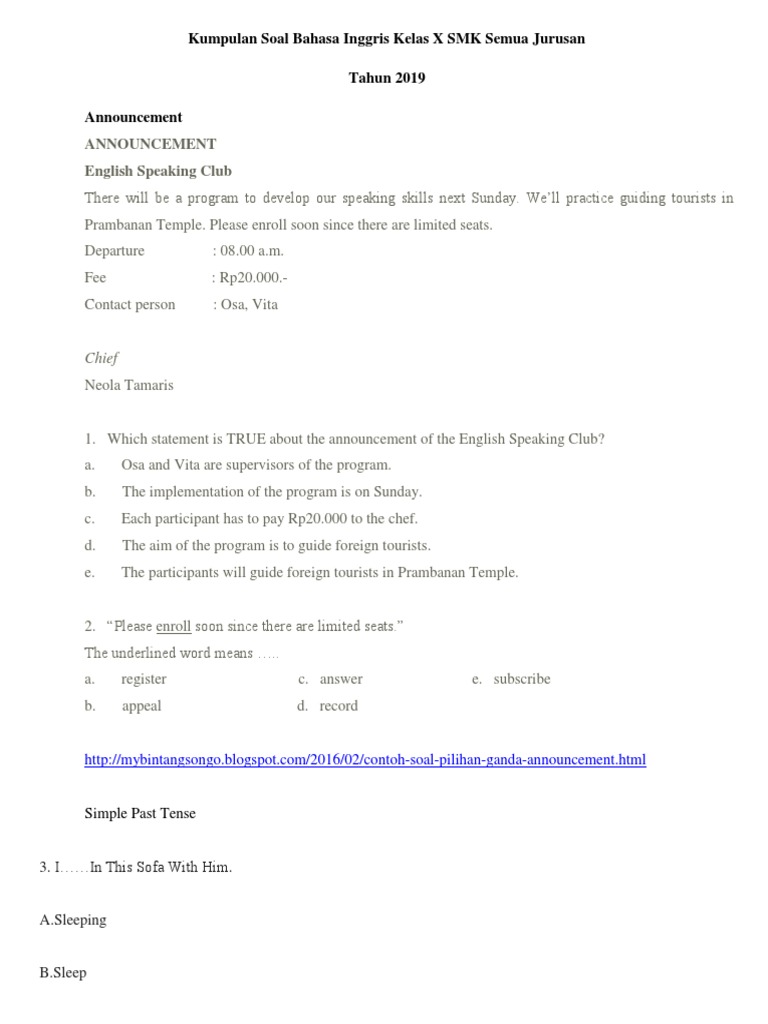 35 contoh latihan soal bahasa inggris pilihan ganda dan. Contoh rpp bahasa inggris sma kelas xi semester 1 speaking. Contoh soal speaking bahasa inggris sma. 15 contoh soal report text dan kunci jawaban terbaru. Soal tes kemampuan bahasa inggris di bawah ini dapat digunakan untuk mengukur sejauh mana kemampuan bahasa inggris anda.