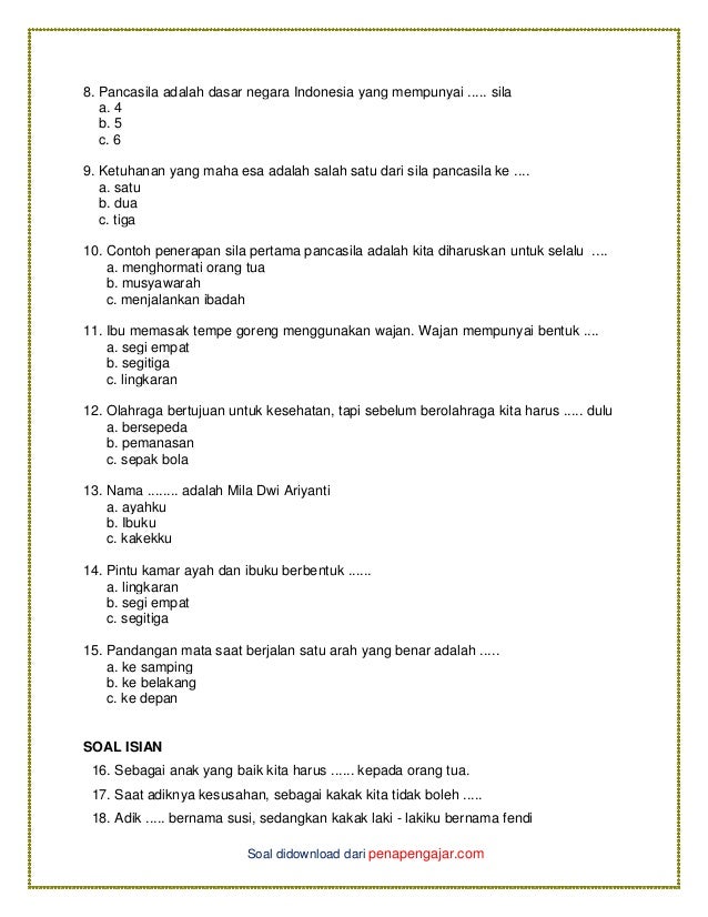Penilaian harian biasanya dilaksanakan setelah satu subtema selesai sehingga dalam 1 tema terdiri dari beberapa ulangan harian sesuai dengan banyaknya subtema. Soal tematik kelas 1 tema 1 subtema 2; Berilah tanda silang (x) pada huruf a, b, c atau d pada jawaban yang benar! Jumlah soal isian singkat : Jumlah soal pilihan ganda :